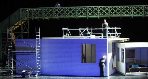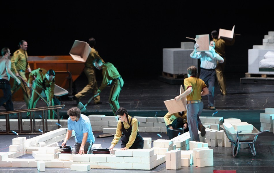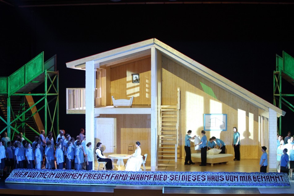 La trama se trae a tiempos modernos, seguramente a los años 60 del pasado siglo, y Elsa quiere construir una casa, labor a la que se entregará posteriormente Lohengrin. El simbolismo de la construcción de algo no está mal traído, si pensamos más en una nueva sociedad que en una casa. Lo cierto es que la casa va levantándose acto a acto, ocupando toda la escena finalmente, y la verdad es que uno acaba bastante harto de ladrillos y cemento. La originalidad de Mr. Jones consiste en que Lohengrin queda abatido ante las preguntas de Elsa en el tercer acto y prende fuego a la casa que han construido, rociándola con gasolina. La escena final consiste en un suicidio colectivo de todo el coro, al abandonarles Lohengrin. Cualquiera se dará cuenta que estas ideas no pueden hacer sino chirriar con el texto y la música. No es la primera vez que se hacen cosas de este tipo. Recuerdo la famosa producción de Peter Konwitschny en el Liceu (la de la escuela) que también chirriaba, pero, al menos, contaba con una magnífica dirección escénica, mientras que en el caso que nos ocupa tal cosa no existe. El coro canta como si estuviera en una versión de concierto, aunque con trajes, mientras que la dirección de actores no pasa de la rutina