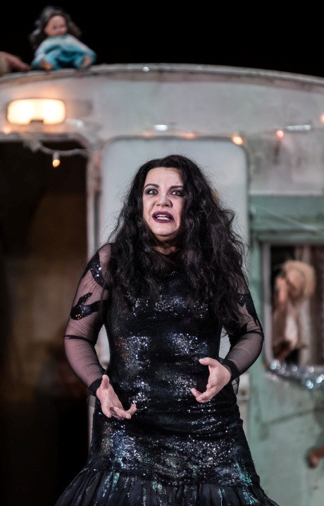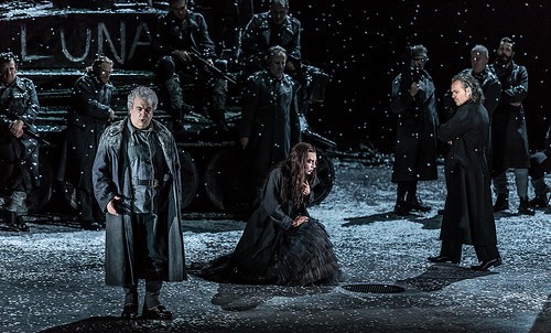 La nueva producción es del director de escena alemán David Bösch, de quien había tenido buenas experiencias anteriores en Munich, con imaginativas y atractivas producciones escénicas en títulos como Meistersinger, L’Elisir, L’Orfeo o Mitridate. No ha sido así en esta ocasión, donde su trabajo no me ha resultado de interés. David Bösch parece trasladar la acción a tiempos recientes, sobre todo a juzgar por la aparición en un momento dado de teléfonos móviles. La escenografía de Patrick Bannwart ofrece un espacio bélico, con la presencia de un gran tanque en varias de las escenas, convirtiéndose en una especie de campo de concentración para el último acto, incluidas alambradas. En las escenas del campamento gitano se sustituye el tanque por una caravana y algunos restos de coches desguazados. El vestuario de Meentje Nielsen es uniformemente gris para las tropas del Conde Luna, mientras que Leonora e Inés visten largos vestidos blancos, siendo todo más colorista para los gitanos, que también parecen estar en guerra. La iluminación de Olaf Winter no tiene mayor relieve.