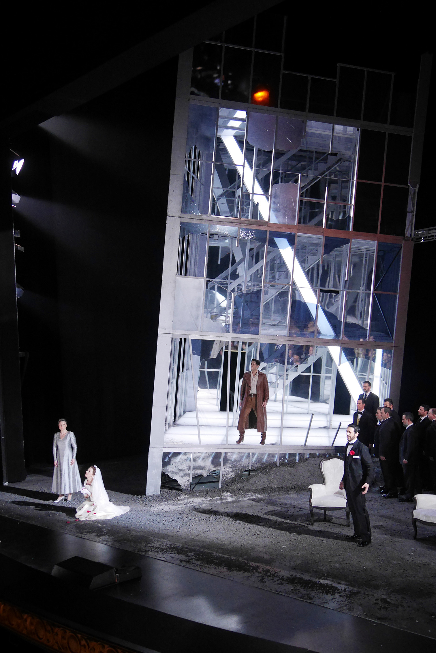 Poco tengo que añadir a lo dicho el día anterior sobre la producción de Damiano Michieletto, que me sigue resultando igual de anodina y aburrida. Únicamente añadiré lo sorprendente que resulta ver a Lucía cantar la escena de la locura con su vestido blanco e inmaculado, en el que no hay ni una gota de sangre, aunque momentos antes Raimondo cante aquello de que Arturo yace en el suelo muto, freddo, insanguinato.