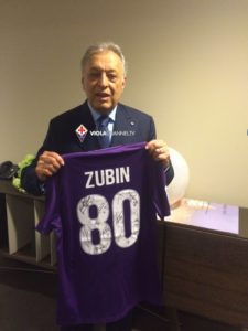 Metha con la camiseta de la Fiorentina firmada por todo el equipo hace pocos días en su 80 cumpleaños