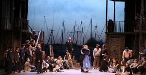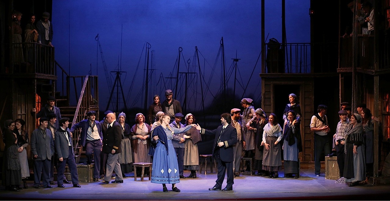 La producción escénica llevaba la firma de Ignacio García y yo estaba convencido de que se trataría de la producción que él hizo hace dos años en el Teatro de la Zarzuela. Confieso mi error, ya que aquella producción seguramente no cabe en el Teatro Gayarre. Así que hemos tenido una producción escénica de bajo coste, en la que la escenografía es única para los tres actos, con unos practicables en forma de casitas a los lados y una tela pintada con barcos al fondo. El vestuario lleva la firma de Teresa Callejo, que imagino lo habrá elegido más que diseñarlo. Iluminación modesta de Paco Ariza. La dirección escénica de Ignacio García brilla por su ausencia y es donde más se nota la evidente falta de ensayos. Su labor no llega ni a la de guardia de tráfico en lo que se refiere a las masas (más bien supuestas) y resulta inexistente con los solistas. No salió a saludar, ocupando su lugar el ayudante. No me extraña.