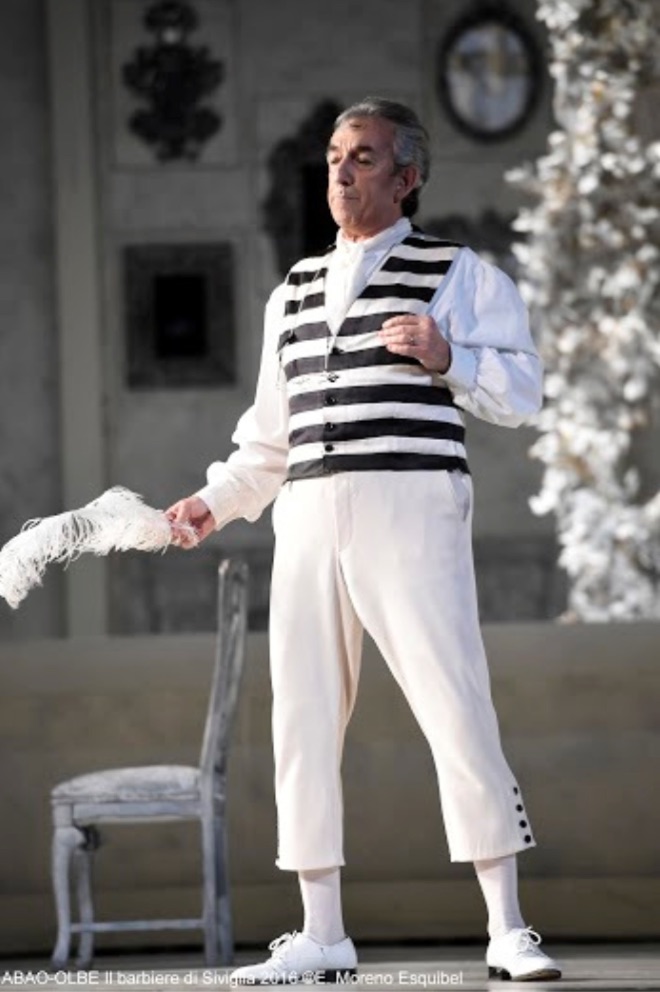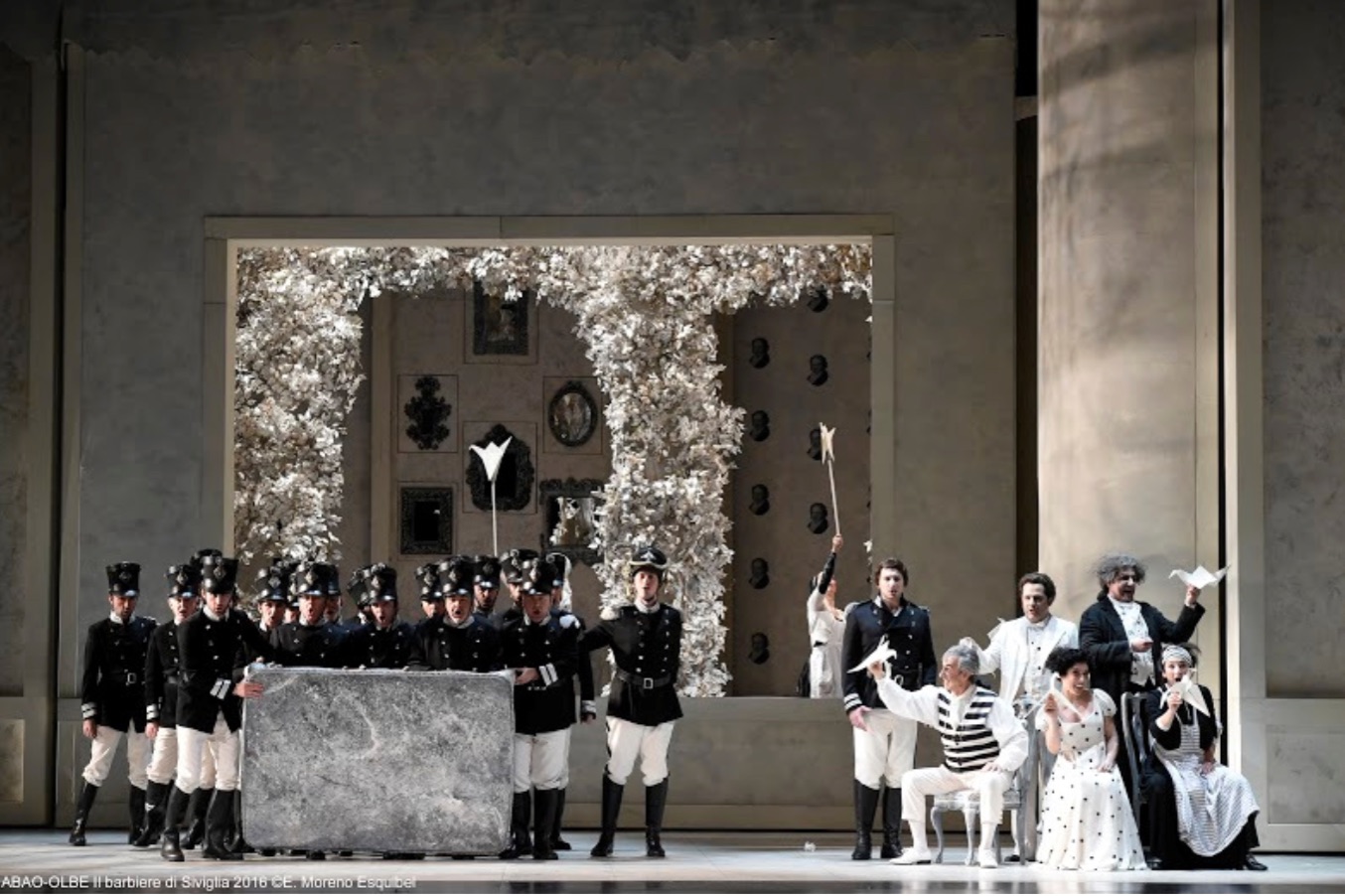 Hacer una producción del Barbero no es tarea fácil, ya que las obras de gran repertorio tienen la gran dificultad de tener que moverse entre lo ya visto y lo novedoso, que a veces desata reacciones airadas, y ya se sabe que no es fácil que llueva a gusto de todos. En esta ocasión Sagi se mueve entre dos aguas y consigue un resultado aceptable, aunque no excepcional. La producción se caracteriza por el constante movimiento de los decorados, manejados por “artistas-tramoyistas”, cuyos movimientos van cambiando las ambientaciones. Los decorados son siempre en tonos blancos o grises y no presentan demasiada originalidad ni atractivo, debiéndose, como es tradicional con Sagi, a Llorenç Corbella. El vestuario también anda entre blancos y negros con algunos tintes bufos y no resulta demasiado conseguido hasta la escena final, en la que Renata Schussheim apuesta por colores vivos, que componen la escena más conseguida de toda la ópera. Correcta la iluminación de Eduardo Bravo. Lo más conseguido de la producción surge a partir de la escena de la tormenta, ganado a partir de ahí en movimiento y colorido para terminar en una fiesta. Sigo considerando que hay exceso de movimiento en escena por parte de un modesto cuerpo de baile, lo que resulta en muchos casos contraproducente. Aunque el programa no hacía referencia a ello, supongo que la dirección escénica de esta reposición la llevó adelante Javier Ulacia, toda vez que Emilio Sagi no apareció en los saludos finales.