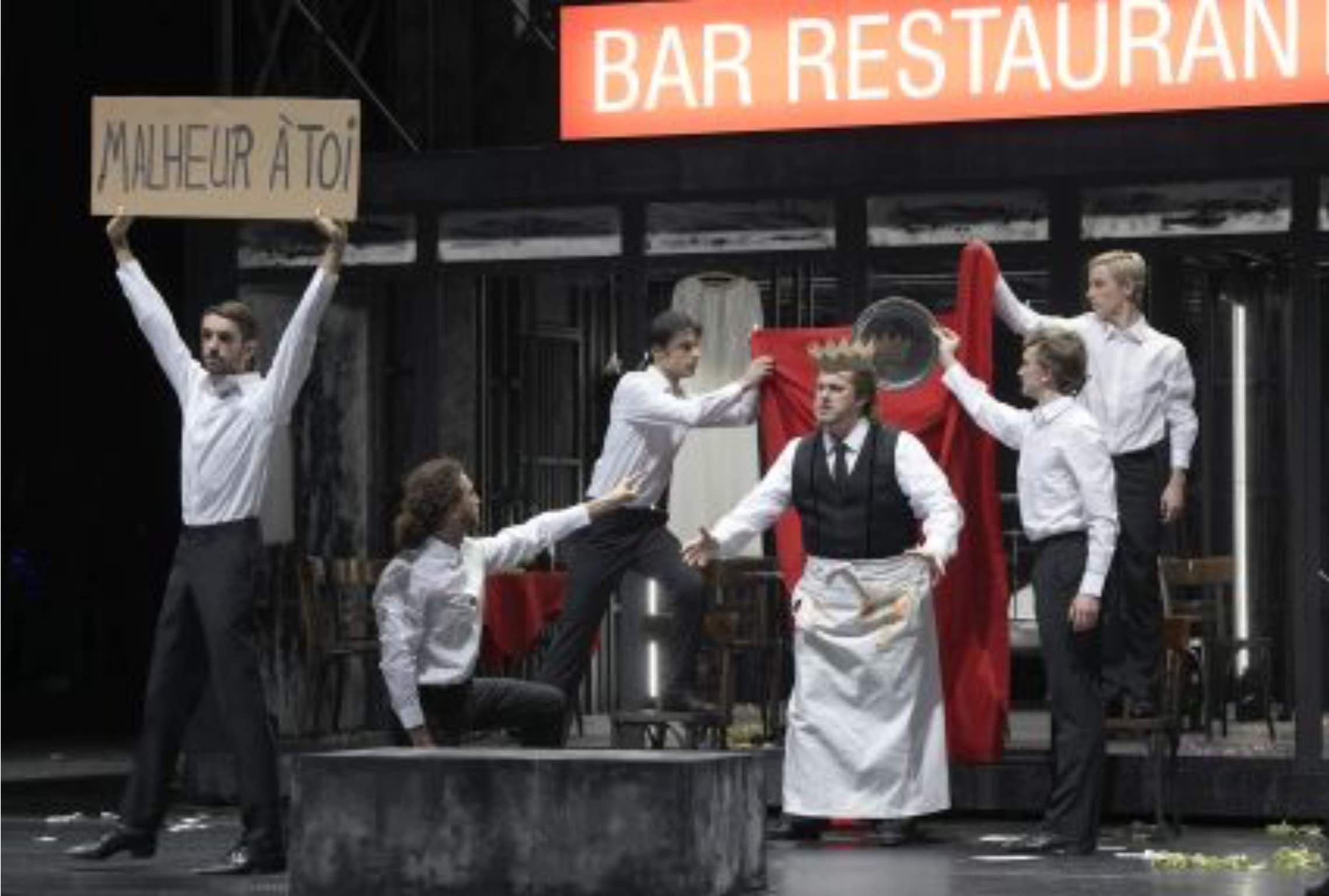 La escenografía y el vestuario se deben a Pierre-André Weitz, ofreciendo como elementos fijos dos paredes laterales que representan dos edificios, mientras que todo el centro y el fondo del escenario ofrecen elementos giratorios, que a veces se mueven en exceso, como ocurre en el caso señalado anteriormente del ballet. Me resultó más convincente la producción en los actos iniciales y finales, en el primero mostrando por un lado los apartamentos de Berthe y Fidès, y por el otro la taberna que regenta Jean. Bien conseguida también la escenografía de la supuesta catedral de Münster en el cuarto acto. Lo menos convincente me resultó el tercer acto, especialmente todo el desarrollo del ballet, en el que el escenario parecía un tiovivo.