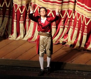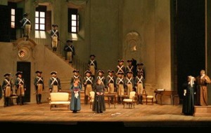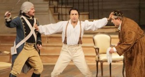 La dirección escénica va por caminos bufonescos, especialmente en lo que se refiere a Don Basilio y Don Bartolo, no faltando algunas morcillas que parecen ser de la cosecha de los intérpretes. Entre ellas destacaré la que mete Juan Diego Flórez disfrazado de Don Alonso, quien, a la pregunta de Don Bartolo sobre su identidad, responde:
