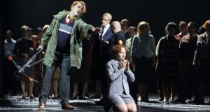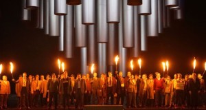 Se trata de una nueva producción, que se estrenó el pasado 28 de Junio y que se debe al joven (30) regista alemán Antú Romero Nunes, quien creo que hace su debut en ópera. La acción se trae a tiempos modernos, lo que no tiene mayor importancia, ya que la ocupación de una nación por otra invasora es tan actual ahora como en la Edad Media. Evidentemente, la tentación de presentar como invasor a la Alemania nazi es evidente y en este caso no se presenta de manera explícita, pero hay detalles que no ofrecen lugar a dudas (uniformes militares negros, botas altas, desfiles al paso de la oca…). La escenografía de Florian Lösche consiste en numerosos tubos de aspecto metálico, cuyo movimiento es continuo para figurar distintas escena, unas mejor conseguidas que otras. Entre las primeras destacaría la figuración de la Iglesia en el arranque de la ópera y el propio bosque en la continuación, mientras que en todo el resto uno acaba un tanto aburrido de tanto movimiento de tubos en todas las alturas y en todas las formas posibles. El vestuario de Annabelle Witt ofrece el contraste entre los uniformes de los supuestos austriacos y el mayor colorido en el pueblo suizo, destacando la escena inicial de los múltiples esponsales. La producción es siempre muy oscura, lo que permite que la iluminación (Michael Bauer) se pueda convertir en protagonista de la ópera, lo que se consigue a medias.
