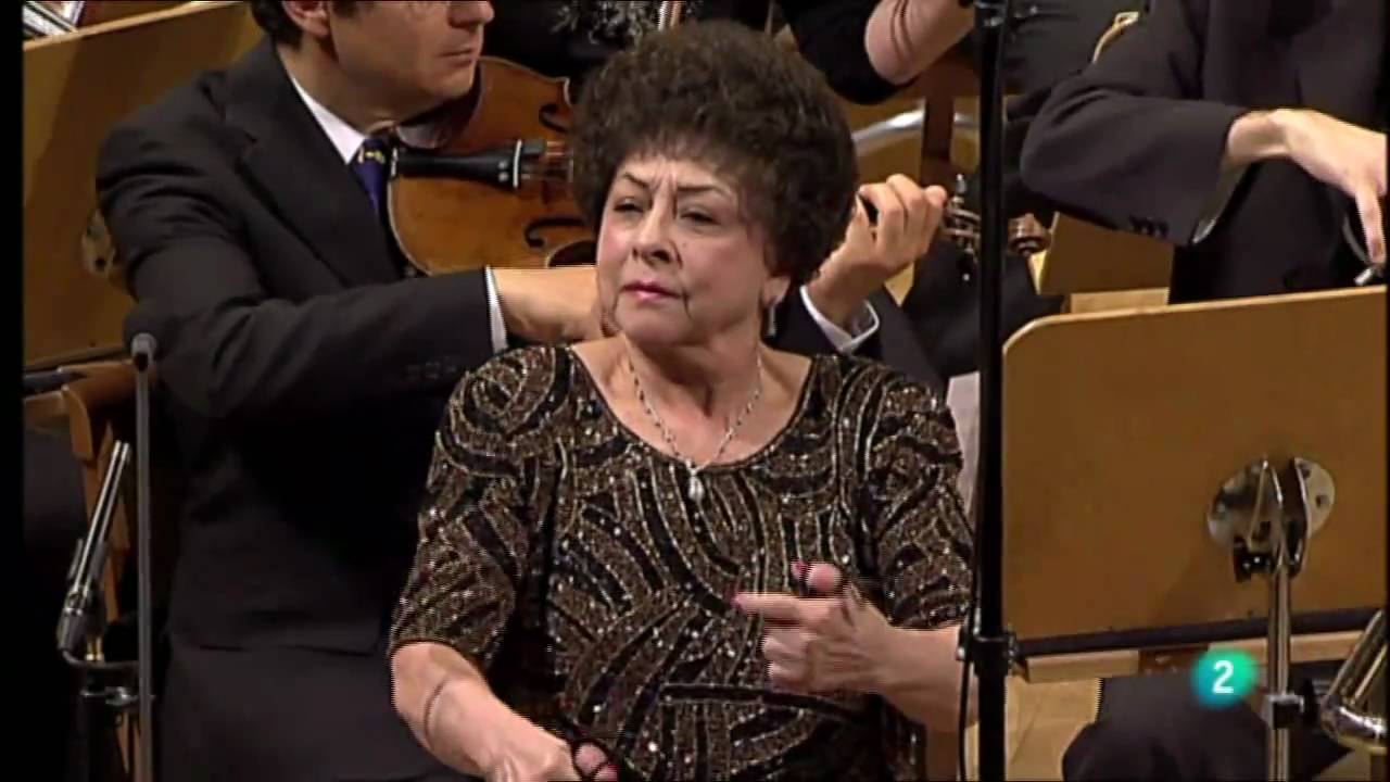 Ahí lo tenemos, erguido, con su crespo y largo pelo con raya al medio, sin aspavientos, con firmeza, de nuevo en el podio de una orquesta a la que ha dirigido centenares de veces, con su cara de póker –aunque lo hemos visto casi sonriente en esta ocasión- y sus modos autoritarios que esconden un discurso elocuente y un criterio que alimenta concepciones plenas de una tensión heredera de las manejadas por Toscanini, aunque con el toque elegante y teatral de Giulini. La soberbia disposición de los amplios brazos, el gesto ceñudo, la clara ondulación de la batuta, el férreo control del ritmo son bazas que dan seguridad a las formaciones a sus órdenes, tanto vocales como instrumentales.