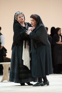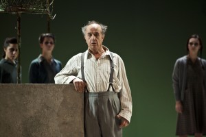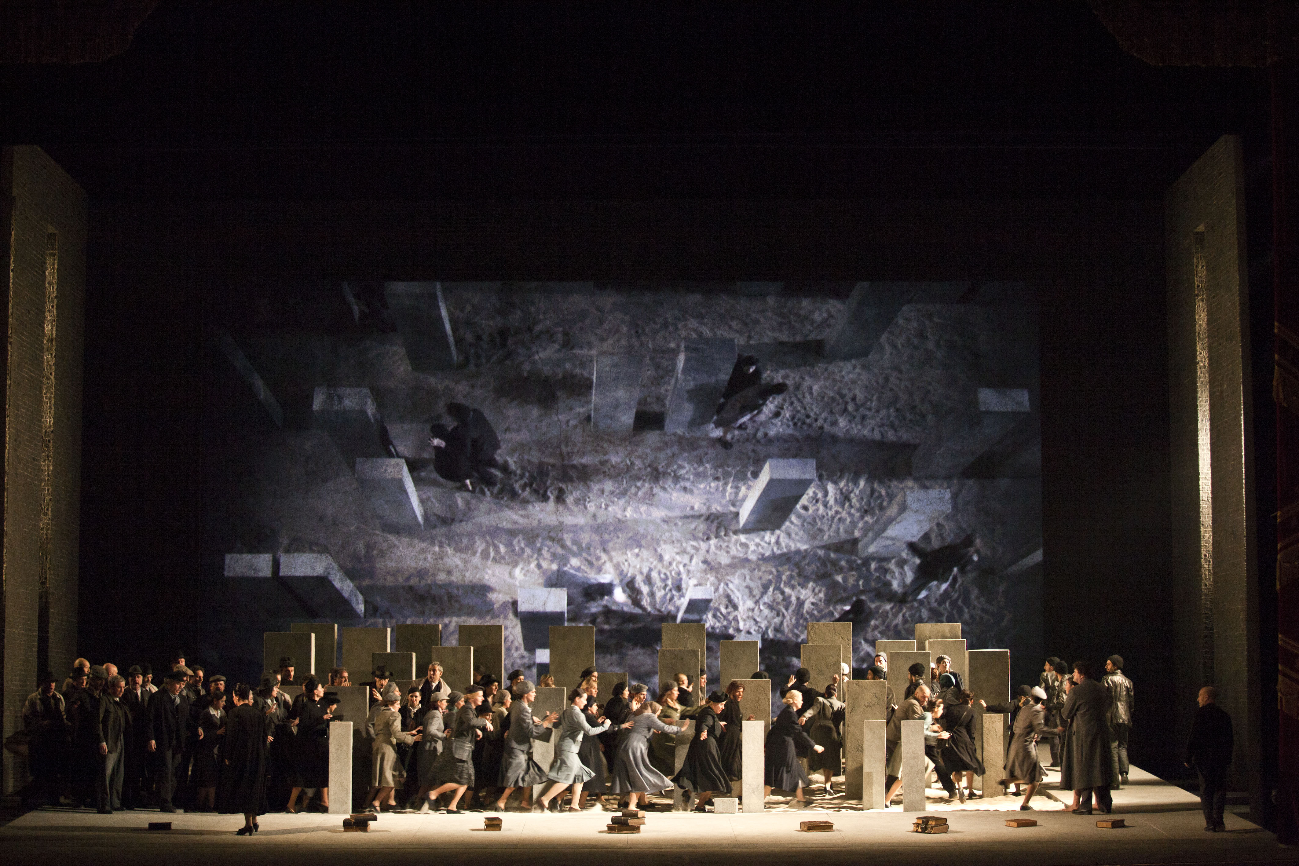 Daniele Abbado nos ofrece una escenografía más o menos minimalista, con un escenario desnudo, en el que al inicio parece que estamos en un cementerio judío, que va siendo derribado, para trasladarnos a algo que puede representar un desierto (arena hay en escena). Tanto la escenografía como el vestuario se deben a Alison Chitty y resultan bastante confusos, trayendo la acción quizá al asentamiento de los judíos en Palestina tras la Segunda Guerra Mundial. ¿Qué ha pretendido decir Daniele Abbado en esta producción? Pues no es fácil saberlo, ni siquiera habiendo leído la entrevista que se publica en el magnífico programa de mano del teatro, en la que uno no entiende ni lo que dice ni lo que pretende decir. La iluminación de Alessandro Carletti no es particularmente destacable. En resumen, una producción confusa y sin interés. Si al menos hubiera apostado por la estética….