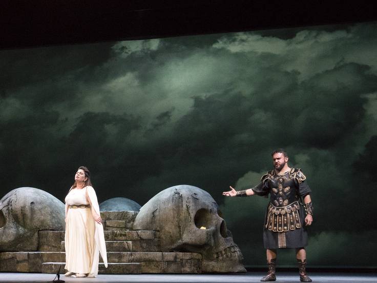 Ha habido cuatro voces importantes. La de Norma ha sido la de la natural de Osetia Veronika Dzhioeva, una soprano que podríamos calificar de “spinto” con rasgos de dramática, de anchurosa y bien asentada emisión, de tinte que podría recordar vagamente al de una Callas. Instrumento bien puesto, bien emitido, bastante extenso, graves sólidos y bastante naturales, no muy abiertos, centro de gran robustez y agudo pleno… hasta el Si bemol. Un Si natural ya le cuesta más y un Do, un riñón. Coloratura discreta, lejos de la perfección. Tiende a cantar en “forte” y son raras las frase líricas bien labradas. Expuso una “Casta diva” muy decorosa, sin arrobarse demasiado.