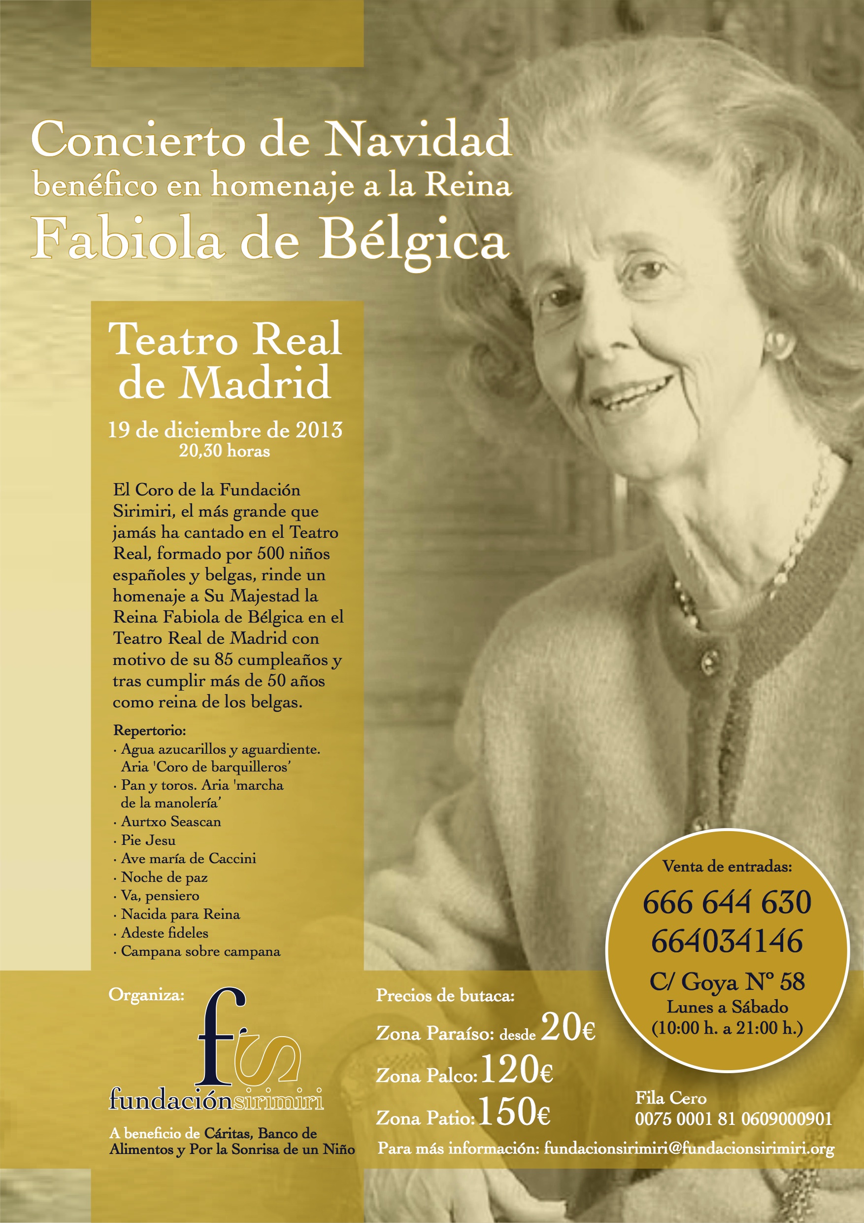 Madrid, noviembre de 2013.- La Reina Fabiola de Bélgica, una de las mujeres españolas con mayor dimensión europea y universal en el último medio siglo, recibirá el próximo 19 de diciembre en el Teatro Real de Madrid (la ciudad que le vio nacer) un sentido homenaje con motivo de su 85 aniversario. El Coro de la Fundación Sirimiri, de 500 niños (la agrupación coral más numerosa que ha actuado en dicho coliseo), ofrecerá en su honor un concierto de Navidad promovido por la Fundación Sirimiri. El beneficio del concierto será donado a Cáritas Española y a la Federación Española de Bancos de Alimentos con el fin de sufragar 500 becas de comedor —el mismo número que los niños que integran el Coro de la Fundación Sirimiri— durante todo el año 2014a escolares de familias necesitadas. Para llegar a este importante objetivo se ha creado una fila cero por la que podrán hacersedonativos a través de la cuenta 0075 0001 81 0609000901.