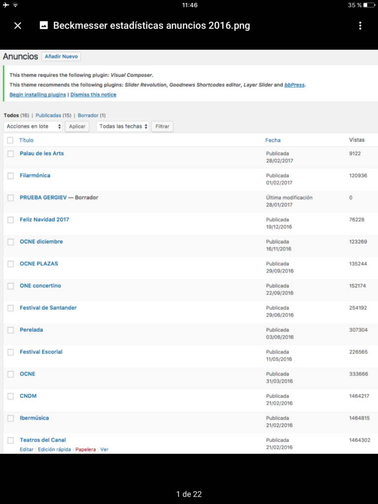 En nuestro afán por la transparencia les ofrecemos de nuevo un dato más: las veces que nuestros lectores han visto a nuestros anunciantes. Merece destacarse que tanto los banner de Ibermúsica, el CNDM y los Teatros del Canal han sido vistos más de un millón cien mil veces desde su publicación en febrero. Este es un dato que debe animar a entidades y empresas a promocionar sus actividades en nuestra web.