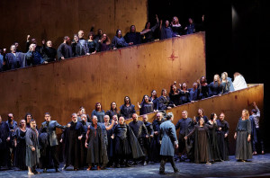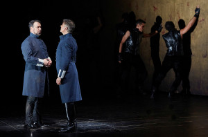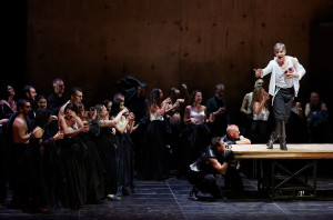 Se trataba de una nueva producción del director de escena catalán Paco Azorín, de quien podremos ver dentro de unos días su producción de Tosca en la Quincena Musical. Paco Azorín deja claro desde el primer momento que lo que él quiere representar no es Otello, sino Iago, a quien convierte – no sin buenos motivos – en el auténtico protagonista de la ópera. Ya antes de comenzar la representación, nos ofrece un telón, donde se puede leer en letras grandes: Iago, de William Shakespeare, estando en escena el mencionado personaje, que es quien incluso dará al maestro la orden de atacar los primeros compases de la ópera. A partir de ahí, Iago está prácticamente siempre en escena, actuando o simplemente espiando los movimientos de los otros personajes. A este malvado personaje le acompaña siempre un grupo de encarnaciones del mal, siempre vestidos de negro, que también sirven para mover los elementos de la escenografía. La producción es simple, pero resulta eficaz y no es de las que molestan, con una eficiente dirección de actores, mientras que se queda mucho más corta la dirección de masas, ya que el coro más parece participar en una versión de concierto.