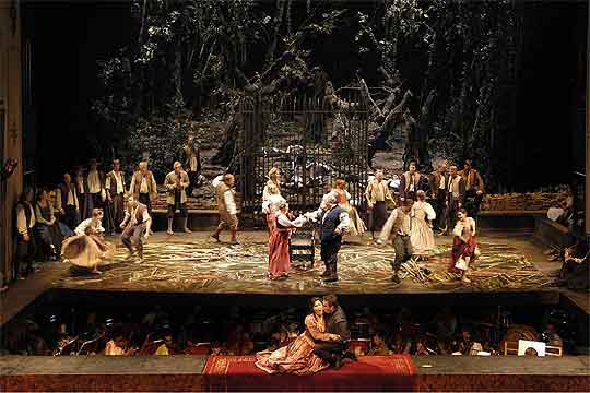 Las otras dos producciones del ROF han sido reposiciones de montajes ya conocidos, pero tratadas con categoría de estrenos. La Pietra del Paragone es una sofisticada comedia de corte goldoniano y pensada para La Scala de Milán, donde fue creada el 26 de noviembre de 1812, en la que el protagonista prueba la verdadera fidelidad de sus amigos en los momentos más comprometidos (de ahí el título de la obra, esa “piedra de toque”), y en ella apreciamos ya ese sentido para los personajes que dará lugar al magistral Barbiere di Siviglia, unos años posterior, y de la que esta deliciosa pieza puede considerarse en muchos aspectos un claro precedente. Pier Luigi Pizzi, con su proverbial elegancia y buen gusto, ha situado a la ociosa sociedad que por aquí deambula en una villa moderna, en una versión que también pudo verse hace unos años en el Real madrileño, bajo la conocedora y entusiasta batuta de Alberto Zedda.