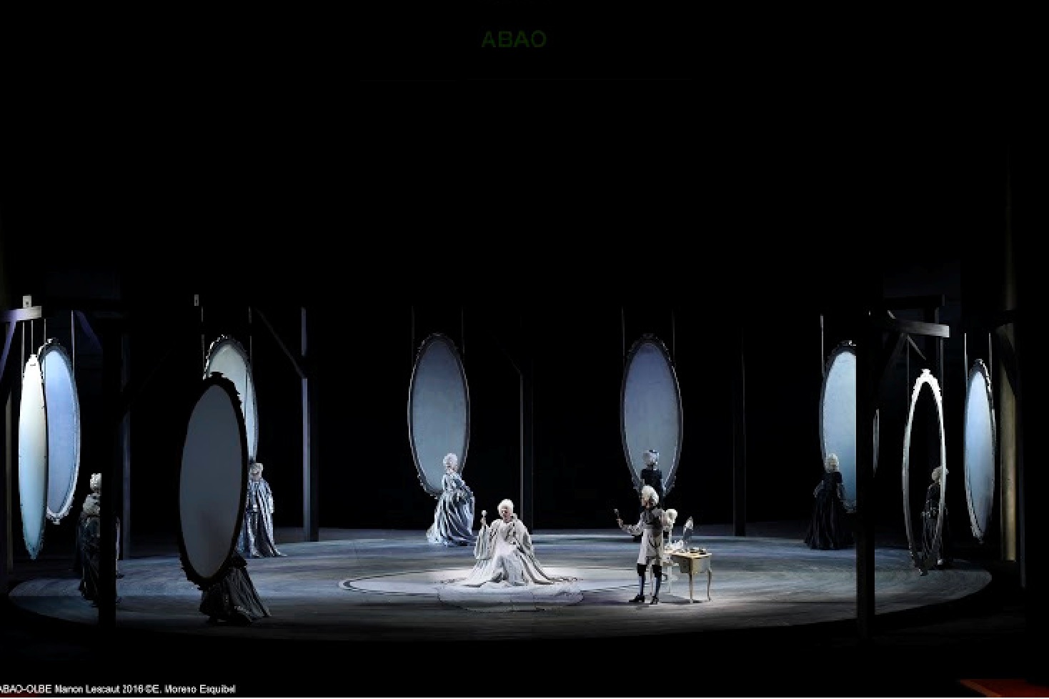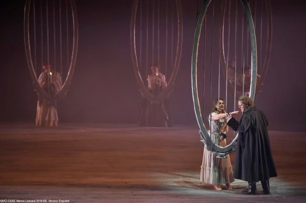 La dirección de escena no tiene nada de excepcional, ofreciendo la acción como recuerdos de Des Grieux, presente en un lateral de la escena, mientras se proyectan unos textos de la obra de Abate Prevost, en los que Des Grieux escribe en primera persona. El mayor problema de la producción estriba en el hecho de exigir dos intermedios y de más de 30 minutos cada uno. Una ópera que apenas supera las 2 horas de duración musical se alarga hasta cerca de las 3 horas y media, lo que resulta a todas luces excesivo. La verdad es que tampoco vi la necesidad de los dos intermedios y tan largos.