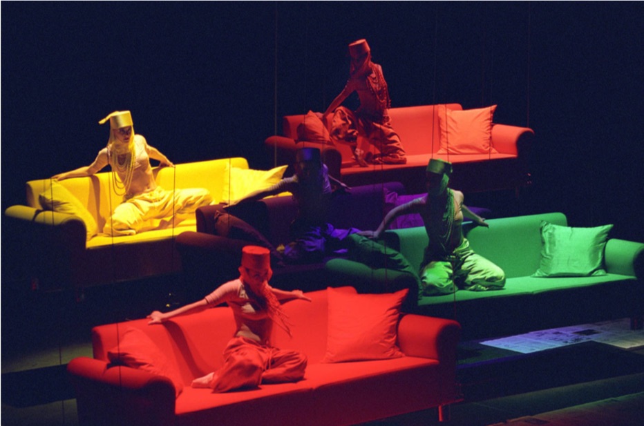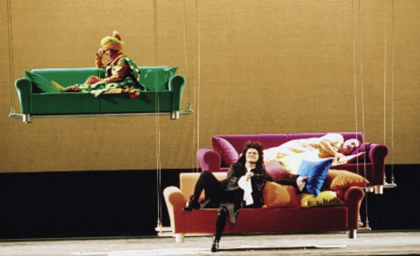 La producción se desarrolla en un supuesto palacio en Turquía, en el que las huríes van vestidas de negro y con velo, mientras que los europeos lucen unos atuendos vistosos y coloristas. No existe una escenografía propiamente dicha, sino un escenario desnudo con una pantalla al fondo, que tampoco se usa demasiado. La escena la ocupan siempre una serie de sofás colgados del techo y movidos por extras, como si fueran una serie de sofás voladores. Al estar los cantantes casi siempre en los mencionados sofás, sus posibilidades de movimientos son muy escasas y más parecen intérpretes de una versión de concierto con trajes. Lo más conseguido de los mencionados sofás es su colorido, pero no consiguen dar vida a la trama en escena.