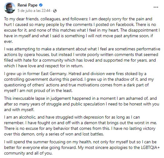 La comunidad virtual e instituciones públicas no tardaron en dar cuenta de la falta. En Berlín, la Staatsoper unter den Linden emitió un comunicado en el que compartió el descontento unánime de su equipo, subrayó su política contra el odio y la discriminación e instó a Pape a pedir disculpas por sus intolerables palabras.