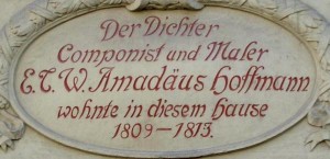 Fue una de las pasiones de este hombre formado en el mundo del Derecho. Como en la música, en la que ejerció en los diferentes campos, lo había sido Mozart, razón por la que cambió el tercero de sus nombres de pila (Wilhelm) por el Amadeus del salzburgués (de ahí las iniciales E.T.A.). Aunque sus últimos días los pasó como jurista en Berlín, donde murió en 1822 y donde está enterrado, hoy Hoffmann es en Bamberg una figura popular, junto a cuyas reproducciones se fotografían los numerosos turistas que acuden a la deslumbrante localidad bávara para ver la tumba de Clemente II, el único Papa enterrado al Norte de los Alpes; el cenotafio de Enrique III y Santa Cunegunda o la escultura del Jinete cuya efigie, al final de la Gran Guerra, protagonizó los billetes alemanes de cien marcos.