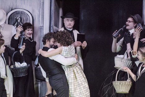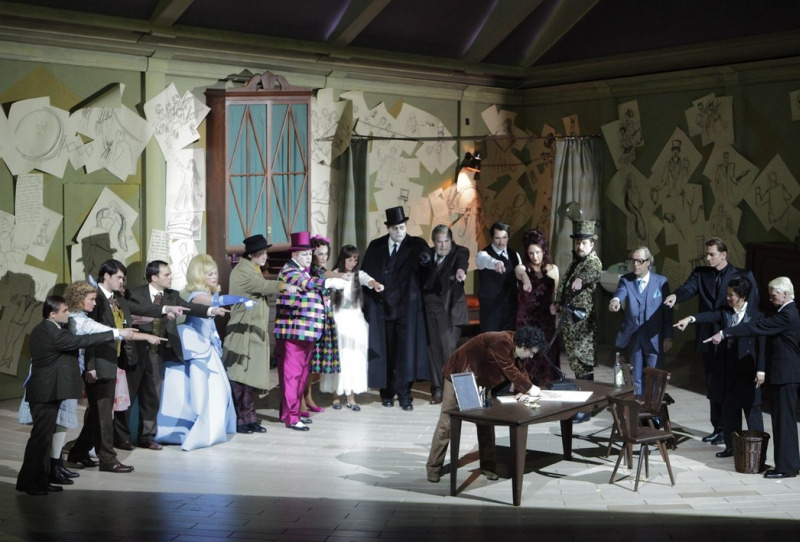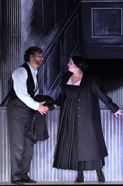 A fin de no ser reiterativo y dejar la explosión de color para Leoncavallo, comienza con un Mascagni en blanco y negro que aleja totalmente escena y música, esa música llena de luz mediterránea. Es más, la acción contradice con frecuencia el libreto, desarrollándose fundamentalmente en un bloque de apartamentos, salvo en la escena de la fachada de la iglesia. Aquellas seis divisiones del escenario representan “soluciones habitacionales” en donde viven Lola y el gánster Alfio, mamma Lucia o un Turiddu que casi parece cohabitar con Santuzza. Más que “Cavalleria” se asemeja a la “Historia de una escalera” de Buero Vallejo, ya que incluso hay escenas en los rellanos de las escaleras de la comunidad. Al final del experimento queda una reflexión malvada: ¿Por qué pagar 600€ por una butaca en el más elitista de los festivales si por 20€ se ven en un cine esos primeros planos a los que inevitablemente lleva Stölzl nuestros ojos en el teatro?