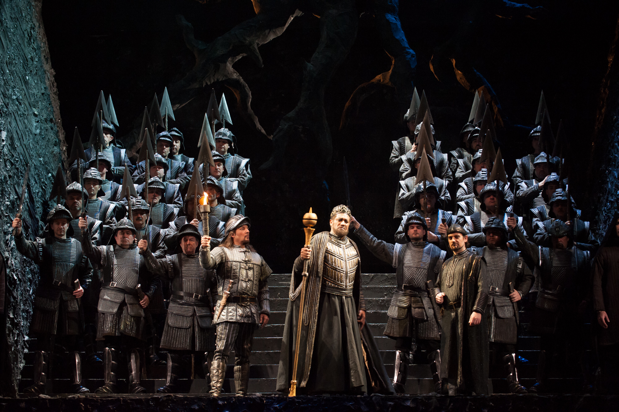 Sevilla nos ha ofrecido la producción de Ermano Olmi procedente del Teatro de la Fenice de Venecia, donde se estrenó en el año 2009. La producción escénica es simple, con escenografía de Arnaldo Pomodoro, que ofrece un escenario en dos niveles, cerrado por muros laterales. En el nivel inferior está la tumba de Libuse, mientras que en la superior hay unas gradas, donde se desarrolla la acción, con protagonismo de un gran roble en el centro. En el último acto la pira funeraria ocupa la parte inferior. El vestuario de Maurizio Millenotti no ofrece mayor interés y cumple bien Juan Manuel Guerra en la iluminación. La dirección escénica la ha llevado adelante en Sevilla Barbara Pessina. Producción simple, que cumple con su cometido de narrar la historia.