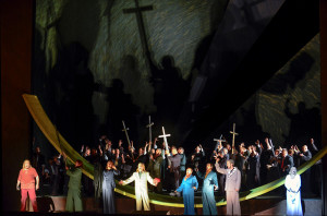 Se ha repuesto la producción de Peter Konwitschny que se estrenara en 1997 y lleva con ésta 67 representaciones en el teatro. A pesar del tiempo transcurrido desde su estreno y de las muchas veces que se ha representado, confieso que nada sabía de la producción y de ahí mi curiosidad por ver qué haría Konwitschny, quien tan dado es a ofrecer lecturas iconoclastas y transgresoras. La verdad es que casi no podía dar crédito a lo que veía, ya que los dos primeros actos de la ópera transcurrieron dentro de una gran tradición, independientemente de que la escenografía o el vestuario pudieran ser más o menos adecuados y atractivos, siempre con la inclinación del regista alemán a tomarse poco en serio los dramas wagnerianos. Como no podía ser de otra manera, Konwitchny salió a la palestra en el último acto con su propia versión de la ópera, que no tiene mucho que ver con la que escribiera Wagner. Elisabeth también muere aquí, pero no de pena por la desaparición de Tannhäuser, sino que se suicida cortándose las venas con el espadón de Wolfram y en brazos de éste. Un final poco apropiado para llegar a ser canonizada. Poco después llega de Roma Tannhäuser, quien se encuentra con su amigo Wolfram, pero no ve el cadáver de Elisabeth, aunque no puede estar más a la vista. Finalmente, también Tannhäuser se suicida, él cortándose la yugular, quedando ambos amantes muertos a los pies de nada menos que Venus, en una composición estética que recuerda a una famosa Piedad.