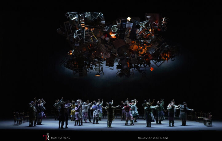 El director de escena Laurent Pelly, que dirige su séptima producción en el Teatro Real, después de La hija del regimiento (2014), Hansel y Gretel (2015), El gallo de oro (2017), Falstaff (2019), El turco en Italia (2023) y Los maestros cantores de Núremberg (2024), se aleja del costumbrismo de La novia vendida, situando la trama en el mundo imaginario de la protagonista ─escenografía de Caroline Ginet─, en el que los personajes evocan los dibujos animados checos de los años 40 a 60, en una graciosa y divertida sincronía con la música, que explora la comicidad e ingenuidad de la obra.