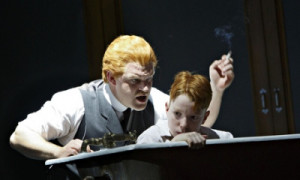 La producción lleva la firma de Annilese Miskimmon y su trabajo no resulta especialmente convincente, en lo que sin duda influyen las características del escenario de Holland Park. La cosa arranca con cierto interés, ya que la escenografía de Leslie Travers nos ofrece un aula de un colegio con sus pupitres, haciendo que la acción se desarrolle en un internado, siendo el Prólogo cantado por el profesor, que sale a escena con sus alumnos en repetidas ocasiones en los distintos interludios orquestales. El vestuario se debe a la misma Leslie Travers y resulta adecuado y fiel a la trama, que parece desarrollarse a principios del siglo pasado. La iluminación corre a cargo de Mark Jonathan y debería haber tenido mucho más relieve, ya que las dimensiones del escenario exigían que un inteligente uso de luces centrara más la atención en los personajes. Es verdad que la luz diurna tampoco ayudaba nada y, únicamente, tuvo interés lo que hizo en la última parte de la ópera, cuando ya era de noche. La dirección escénica de Annilese Miskimmon me pareció poco imaginativa, aunque tuvo algunos momentos de interés, especialmente la aparición de los fantasmas de Miss Jessel y Peter Quint a través de los cristales de unos armarios, Creo que esta producción podría ganar bastante retrasando la hora de comienzo del espectáculo y usando proyecciones que podrían romper con los inconveniente del escenario.