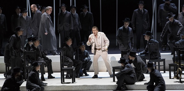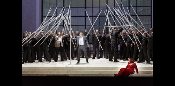 La producción que nos ha ofrecido Dresde es, como todo el resto de la Tetralogía, la que se hizo en coproducción con el Teatro Real de Madrid, donde se pudo ver entre Mayo de 2002 y Marzo de 2004. La producción lleva la firma de Willy Decker y muchos aficionados la recordarán como la de las butacas, ya que muchas escenas se desarrollan justamente en un patio de butacas de un teatro. Tengo que decir que Willy Decker casi prescinde de las butacas en esta última entrega. Apenas aparecen en las escenas inicial y final de la ópera.