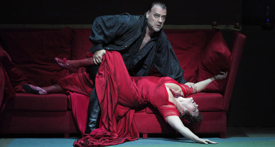La dirección escénica de Luc Bondy ofrece algunos detalles interesantes y otros menos conseguidos. En cualquier caso, los tres protagonistas son lo que siempre han sido en tantas producciones. Los toques más personales aparecen en el acto segundo, que arranca con Scarpia rodeado de algunas putillas, siendo asesinado por Tosca no de una, sino de repetidas cuchilladas. Luc Bondy prescinde de candelabros y crucifijos en el final del acto, quedándose Tosca en los últimos compases tumbada en el sofá de al lado, dándose aire con el abanico de la Atavanti (nada más natural, tras el esfuerzo realizado). No parece tener prisa la diva, ya que todavía tiene tiempo de pasar por casa y aparecer en la fortaleza con un nuevo modelo, por cierto muy poco apropiado para salir en calesa hacia Civitavecchia. El tercer acto sigue dentro de la más pura tradición, mientras que el Te Deum del primer acto es muy pobre y bastante mal realizado. En resumen, este trabajo no responde en absoluto al famoso “eurotrash” que condenan los americanos y muchos aficionados a la ópera, sino a una producción clásica y tradicional, un tanto pobretona y con poco interés.