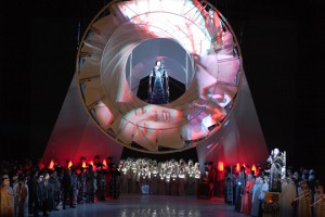 La producción es un puro exceso, aparte de la presencia de patinadoras en escena, en la que estamos ante el movimiento continuo. Todo se mueve y de manera continuada, excepto los cantantes. Cuando no tenemos patinadores, tenemos danzantes, o bien figurantes subidos en trapecios o tramoyistas poniendo cables de seguridad a sus compañeros, o bien proyecciones permanentes, para cuyo disfrute se entregan unas gafas de plástico a los espectadores, con instrucciones para usarlas en la pantalla de los sobretítulos. Por tanto, a este movimiento permanente hay que añadir el ruido de los espectadores en busca de las gafas. Desde mi punto de vista no hay nada más en toda la producción, sino afán de protagonismo por parte de los componentes de La Fura. A una producción hay que exigirle que no moleste el desarrollo musical y ésta se caracteriza por todo lo contrario. Finalmente, no sé si estamos en un circo o, como alguien ha dicho, en un cómic en escena.