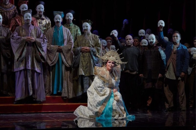 El trabajo escénico de Mario Gas resulta adecuado, narrando bien la trama, hasta que aporta su visión un tanto original de la ópera. Me estoy refiriendo al hecho de sobra conocido de que Puccini no hubiera terminado de componer la ópera, sino que fue culminada para la escena final por Franco Alfano. Al termina la escena de la muerte de Liú, la orquesta para y la producción informa al público por megafonía de que en su estreno Toscanini terminó aquí la representación, siendo posteriormente la ópera completada musicalmente por Franco Alfano. Mario Gas sigue el ejemplo mencionado de Toscanini, pero la representación sigue, aunque toda la escena final se hace en versión de concierto y con vestuario como si de un concierto se tratara, efectivamente. La decisión de Mario Gas se me hace muy discutible y bastante gratuita, independientemente de que la cosa haya funcionado adecuadamente. Me refiero al hecho de que lo que Puccini no terminó fue la composición, lo que poco o nada tiene que ver con la producción escénica. Me habría parecido más lógico que se terminara la representación con la muerte de Liu que no el hecho de continuarla en forma concertante y sin vestuario alusivo a la ópera. Personalmente, no alcanzo a ver la lógica de esta decisión por parte de Mario Gas.
