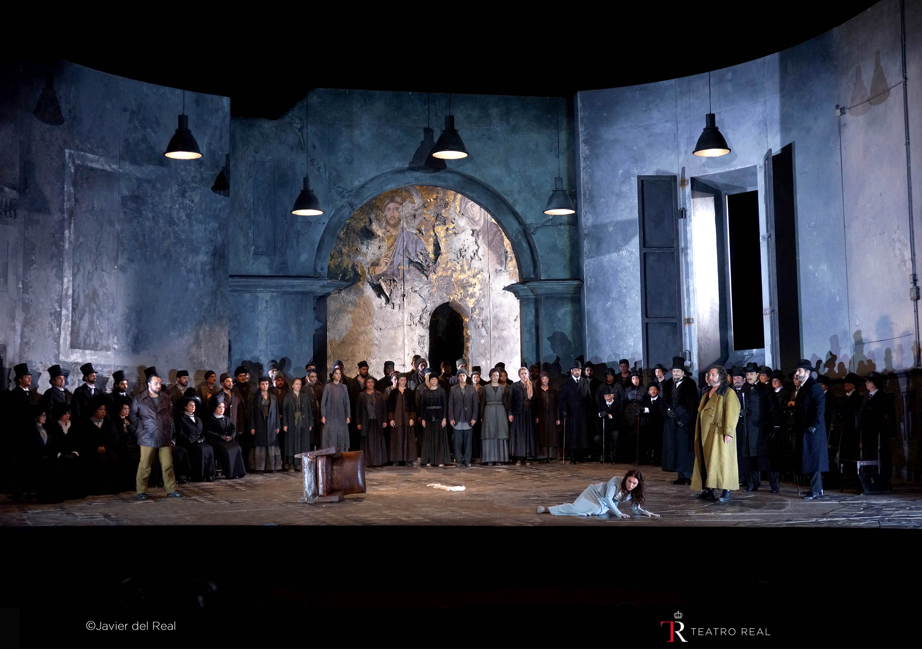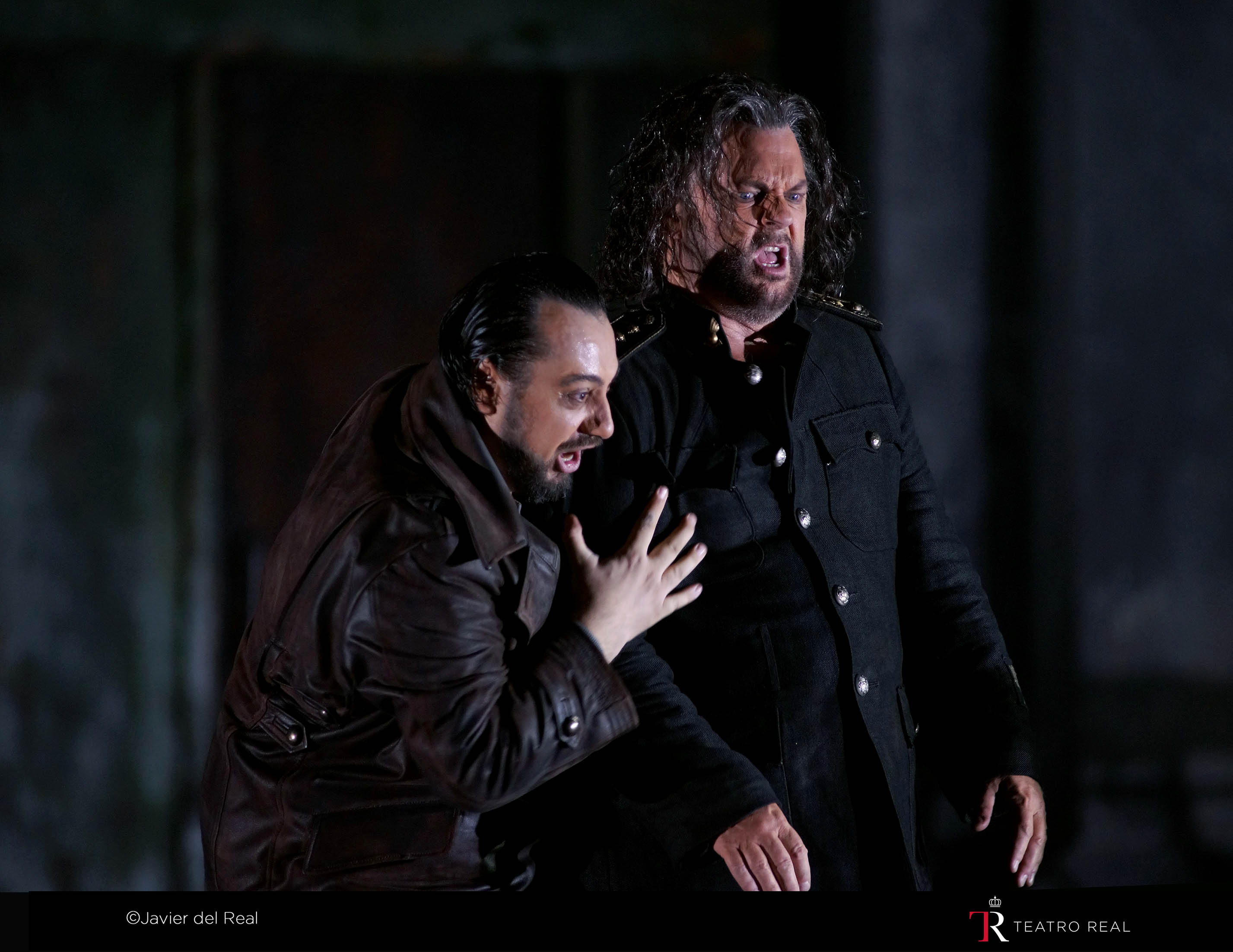 Segundo porque, conocida la producción, ésta resulta pequeña y pobre para un teatro como el Real, lo que también apunta a lo anterior. Está bien para la ENO, mucho más pequeña. Presenta un único escenario en una espacio público, un patio amurallado de pesante mampostería grisácea y ambiente lúgubre y claustrofóbico, en el que se desarrolla todo con cambios mínimos. Tan pocos que hasta en ese patio ha de morir Desdémona, sin cama obviamente y sin la menor emoción. No hay por tanto lugar para la intimidad y ésta existe en “Otello”. Hay bastantes puntos discutibles, como la “blancura” del personaje, convertido en un musulmán converso al cristianismo sin que la escena revele el motivo. Yago, en el texto verdiano, lo califica como “moro”, que es algo bien distinto, pero ya estamos habituado –también hartos- a que nos cambien las cosas. Que Yago y Otello se hagan hermanos de sangre, pase. Menos que se convierta a Roderigo en una especie de paseante en cortes. “El imperio musulmán yace sepultado en el mar” anuncia Otello en su primera aparición, pero la acción se desarrolla ahora entre las dos guerras del siglo pasado y lo que parece sepultado es el poderío veneciano. Escena pobre y provinciana. Dispuestos a inaugurar la temporada del supuesto –no tan real pero sí productivo- bicentenario, habría valido la pena otro tipo de producción.