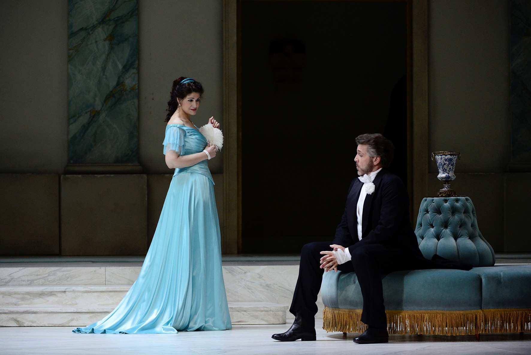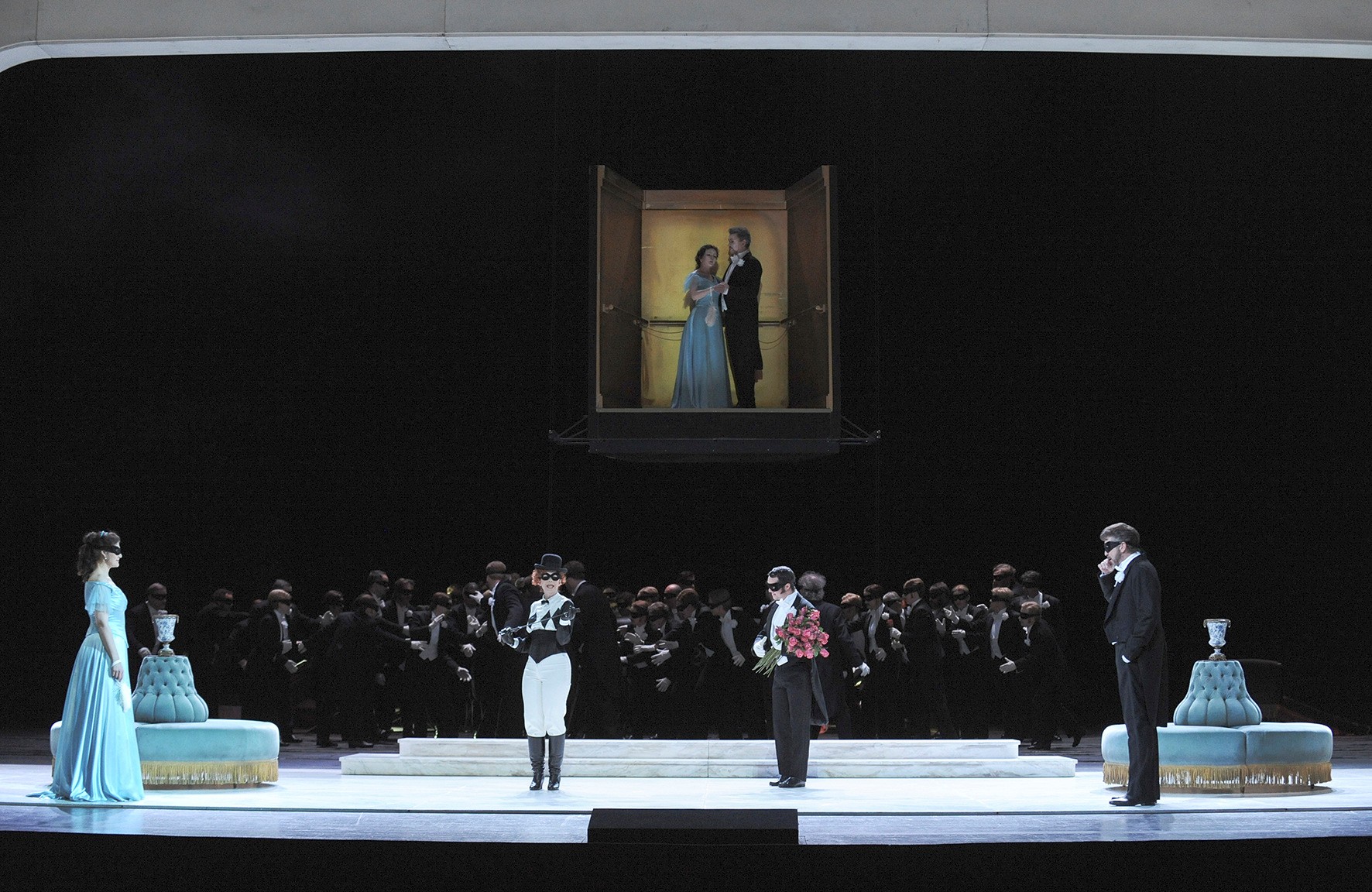 La producción ofrecida por la Semperoper es una coproducción con el Festival de Pascua de Salzburgo, donde se estrenó durante el pasado mes de Abril y también bajo la dirección de Christian Thielemann. La producción escénica lleva la firma de Florentine Klepper, que ya ha hecho varios trabajos para la Semperoper. La verdad es que esta ópera admite muy mal cualquier tipo de relecturas. La escenografía de Martina Segna ofrece en el primer acto tres módulos, que se desplazan lateralmente, presentando las habitaciones de hotel de los Waldner, la sala de estar y la habitación de las hijas. En el segundo acto nos trasladamos al hall del hotel, donde tiene lugar el baile, para volver en el tercer acto al mismo hall, donde se desarrolla toda la trama de equívocos. El vestuario de Anna Sofie Tuma se apega al libreto y resulta atractivo en el caso de Arabella.