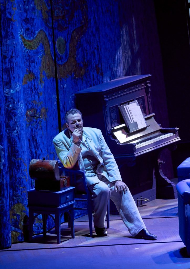 La producción escénica se debe al director de escena suizo Marco Arturo Marelli y se estrenó aquí la temporada pasada. Marco Arturo Marelli es un avezado director de escena, cuyas producciones se caracterizan por el buen gusto y no suele ser muy dado a relecturas o a versiones conceptuales, por llamarlas de alguna manera. Sin embargo, aquí nos ofrece algo distinto. La producción parece centrarse en el deseo y obsesión de Giacomo Puccini por esta ópera, que bien sabido es la dejó inacabada. Ya en las primeras notas de la partitura estamos en la casa de Puccini, que no es otro que el que luego será Calaf, trabajando en la partitura, para pasar después a un teatro, donde el coro ocupa las butacas de los espectadores, con un escenario en el que deambulan los personajes más importantes de la ópera. Lo mismo ocurre en el tercer acto, que se desarrolla en el estudio de Puccini-Calaf, volviendo para la escena final al teatro mencionado anteriormente. Estamos en una China poco tradicional, ya que los personajes no son chinos sino de modo excepcional. De hecho Liú en el arranque de la ópera y del tercer acto es la criada de Puccini, queriendo representar a Doria, sirvienta en la realidad del compositor y que también murió suicidándose como Liú.
