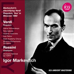 Curiosa interpretación del “Requiem” de Verdi en 1960 en Moscú, ciudad poco propicia entonces a las religiosidades de la partitura que el compositor dedicó a la memoria de Manzoni. Por eso Markevitch decidió resaltar sus trazos operísticos, ofreciendo una versión de potente teatralidad, en la que contó con una Galina Visnevskaya en plenitud de su carrera y el bajo Ivan Petrov que no le iba a la zaga. La publicación se completa con varias oberturas rossinianas. Gonzalo Alonso